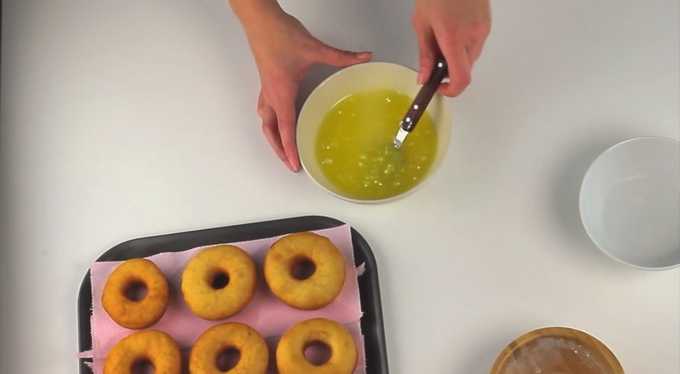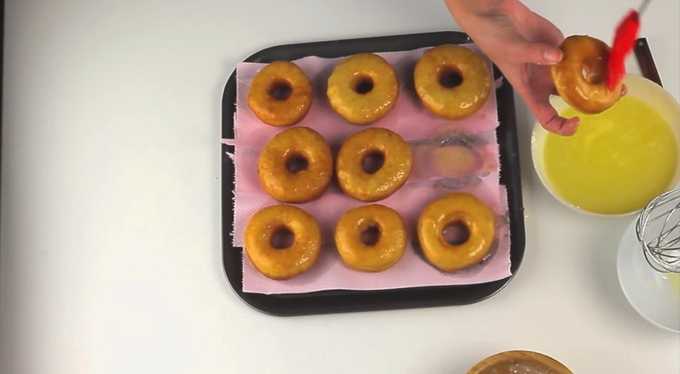 Vet de donuts met het resulterende glazuur aan beide kanten in met een siliconenborstel. We verspreiden ze op een plat oppervlak om af te koelen en het glazuur te fixeren.