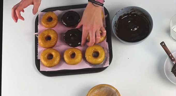 - Verwarm de oven voor op 180 graden en zet de bakplaat met ringen op het middelste niveau. We bakken donuts in twintig tot vijfentwintig minuten goudbruin.