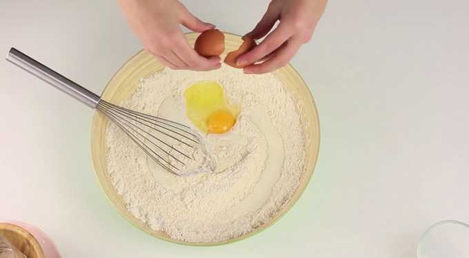 - Zeef de bloem samen met het bakpoeder in een kom. Meng in een aparte kom de gecondenseerde melk, eieren en zout. Roer alles met een garde door elkaar tot het helemaal homogeen is. Giet het voorbereide vloeibare mengsel bij de bloem en kneed het deeg. Eerst werken we met een lepel, daarna met onze handen. De massa blijkt behoorlijk steil te zijn, je kunt het vergelijken met knoedelsdeeg.