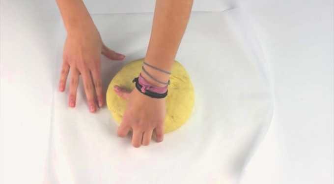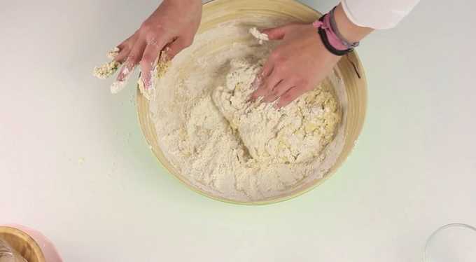 - Kneed het deeg met je handen. Wanneer de massa alle componenten combineert en aan je handen begint te kleven, voeg je de resterende bloem toe. Het afgewerkte deeg moet zacht en volgzaam zijn, niet steil.