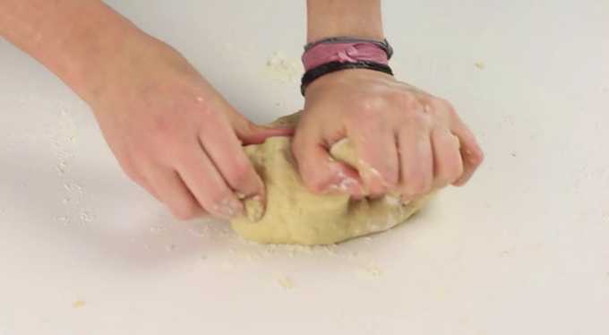 - Giet de gezeefde bloem in kleine porties en kneed goed na elke toevoeging. Afhankelijk van de eigenschappen van een bepaald meel kan het zijn dat je er meer of minder van nodig hebt dan aangegeven in het recept.