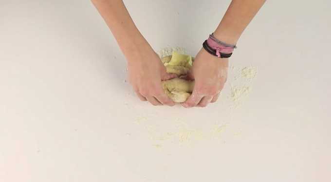 - Kneed het deeg eerst met een lepel en daarna met je handen. De massa moet zich goed vormen en niet meer aan je handen plakken. Indien nodig kun je nog wat bloem toevoegen, maar het is belangrijk om op tijd te stoppen en het deeg niet steil te maken.