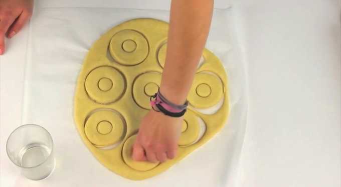 - Rol het resulterende deeg met een deegroller uit op een met bloem bestoven werkvlak. De dikte van het walsen is zeven tot acht millimeter. We snijden cirkels uit met een speciale vorm of een eenvoudig glas. We maken kleinere gaten in het midden. Het is handig om hiervoor een kleine plastic flesdop te gebruiken.