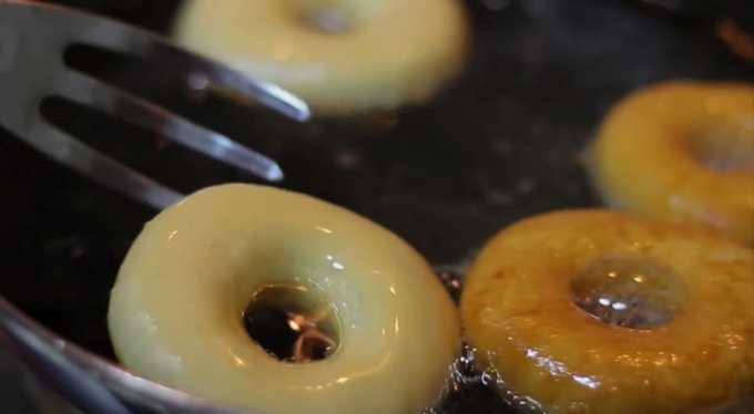 Verwarm in een steelpan of frituurpan de geurloze plantaardige olie in een zodanige hoeveelheid dat deze de bodem bedekt met een laag van twee tot drie centimeter. Leg donuts in hete olie zodat ze vrij liggen en elkaar niet raken. Vergeet niet dat tijdens het frituren de ringen zullen groeien en minstens anderhalf keer in volume toenemen. Bak de donuts aan beide kanten goudbruin.