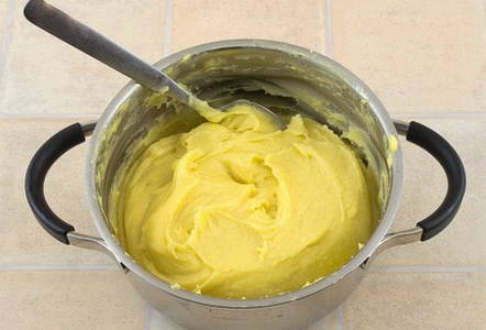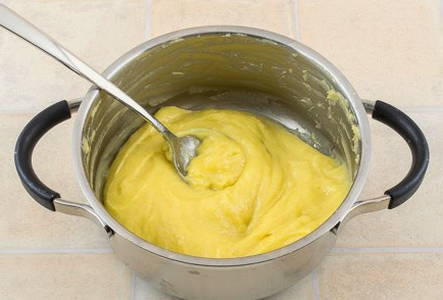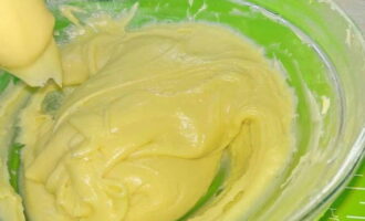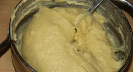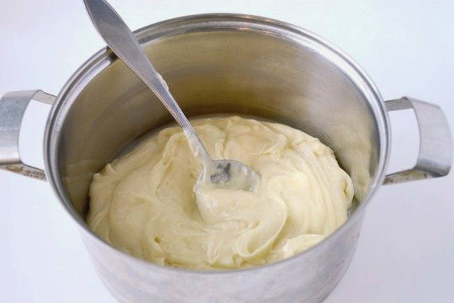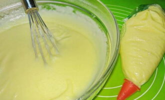 Klop eieren met suiker en vanille, voeg bloem en melk toe. We koken de massa gedurende 2 minuten, onder regelmatig roeren.