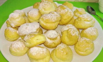 Vul de soesjes met custard met behulp van een deegspuit. Klassieke soesjes zijn klaar. Serveer ze op tafel, garneer met poedersuiker.