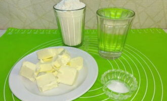 Laten we de benodigde hoeveelheid producten voor het deeg afmeten. Verdeel de zachte boter in stukjes.