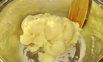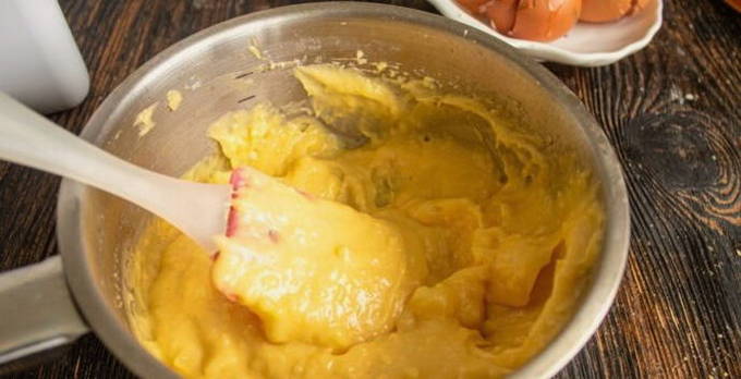- We halen het werkstuk van het vuur en voegen er bloem en kippeneieren aan toe. Kneed tot een homogeen vloeibaar deeg is verkregen.