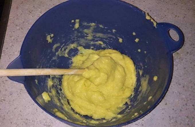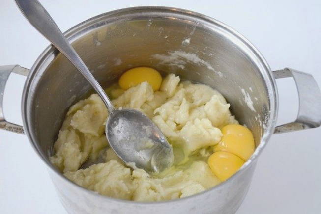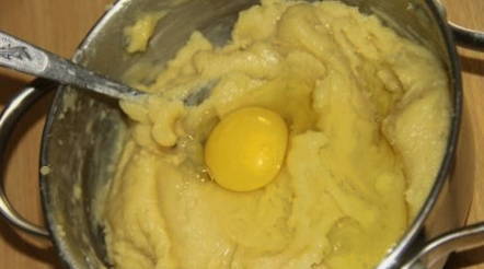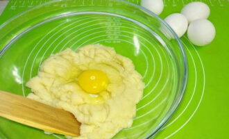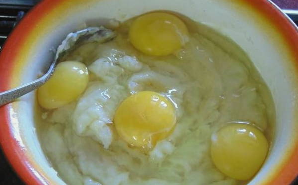 - Breek kippeneieren in het afgekoelde product. Kneed opnieuw tot een gladde massa.