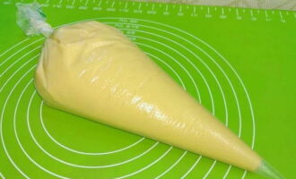 - We plaatsen het deeg in een spuitzak. Gebruik het om de soesjes op een bakplaat met bakpapier te persen.