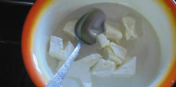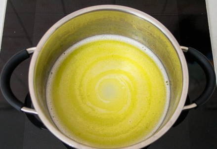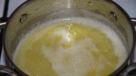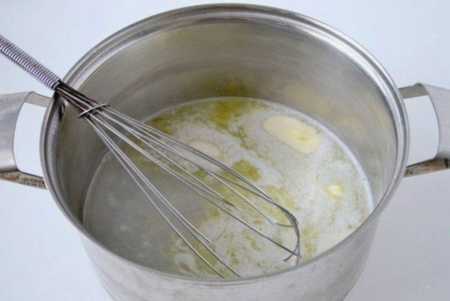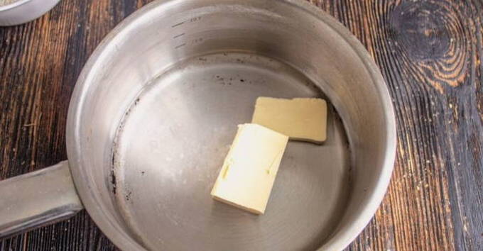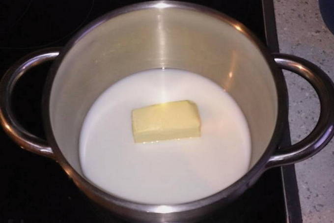 - We koken water met melk. Smelt de boter in de vloeistof en los een snufje zout op.