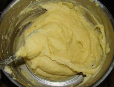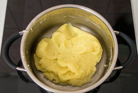 - Smelt de boter en voeg er water en gezeefde bloem aan toe. Roer de massa actief en bewaar deze op het fornuis. Roer op het einde de eieren erdoor.