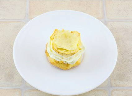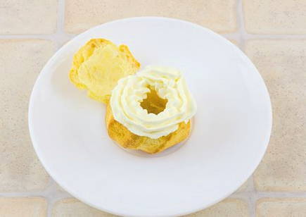 - Snijd in de afgekoelde soesjes voorzichtig het deksel eraf en vul het product met de eerste vulling.