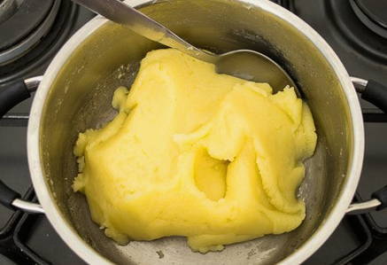 We blijven het eten op het vuur houden. Roer ze krachtig tot een homogene massa is gevormd.