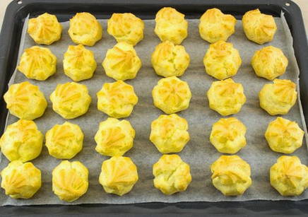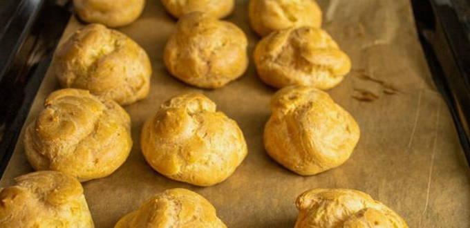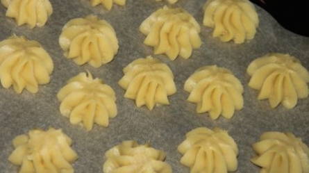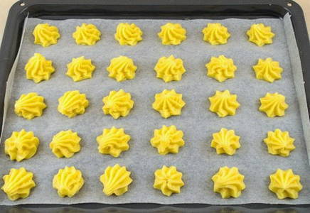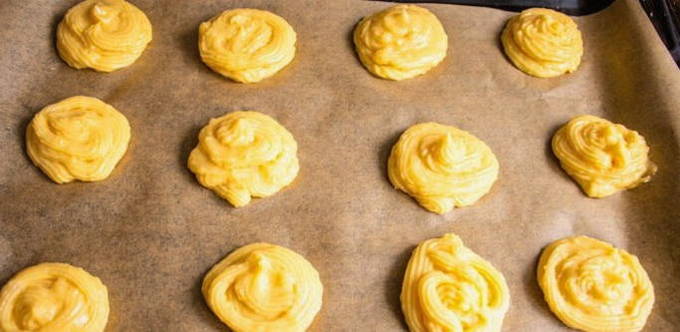 - Knijp met een spuitzak het custarddeeg uit op een bakplaat met bakpapier.