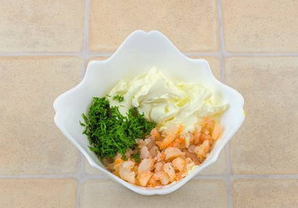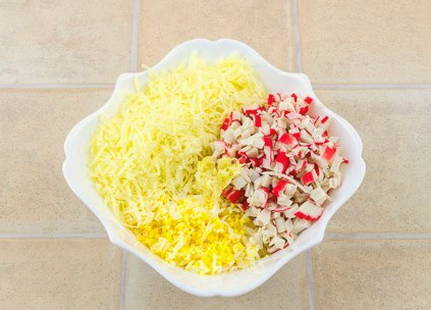 - Laten we nu beginnen met vullen. Ze kunnen verschillend zijn. Rasp voor de eerste optie krabsticks, kippeneieren en harde kaas. We vullen de producten met mayonaise en roeren.