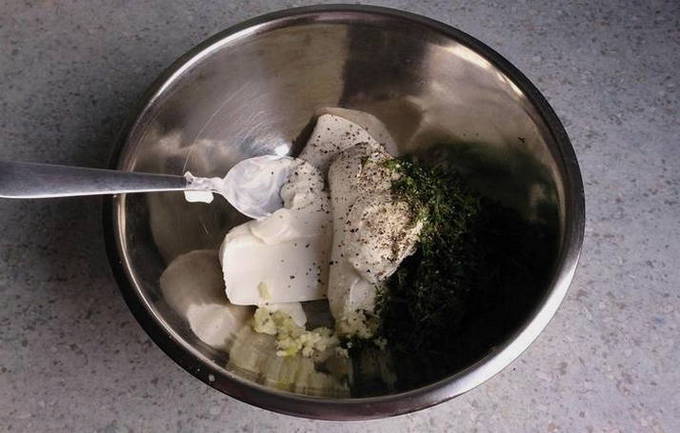 - Meng voor de vulling kwark met kruiden, gehakte knoflook en dille in een kom. Wij kneden de producten.
