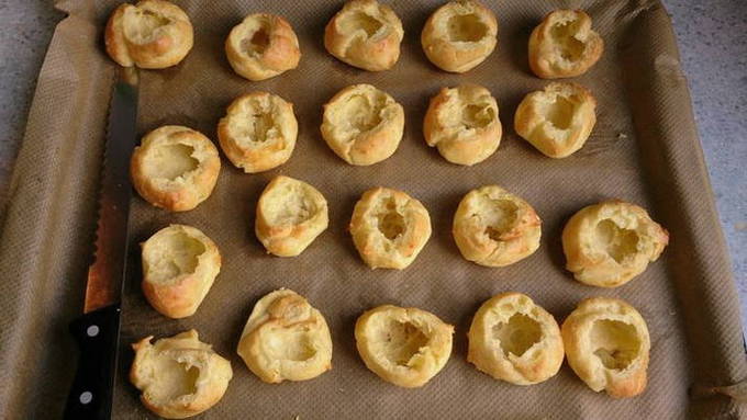 - Snijd de bovenkant van de afgewerkte soesjes.