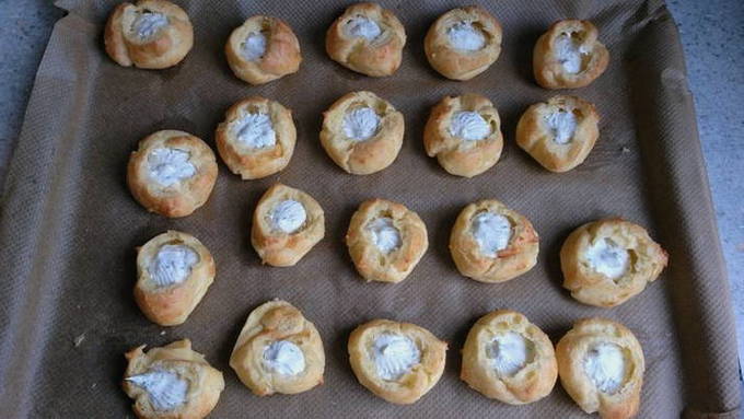 - Snijd het deksel van de soesjes en vul ze met zure room en kaasroom.
