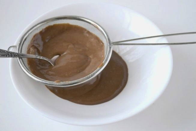 - We vullen de room aan met gesmolten pure chocolade. We vegen het werkstuk door een fijne zeef.