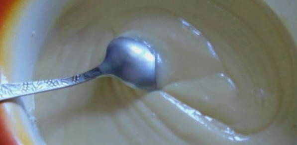 - Om de room te bereiden, giet je het voorbereide mengsel met melk. We zetten de massa op het vuur en koken deze 4 minuten onder actief roeren.