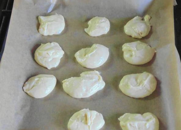 - We verdelen het zachte deeg op een bakplaat met perkament. We verspreiden het mengsel met een theelepel. We bakken 30 minuten op een temperatuur van 200 graden.