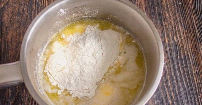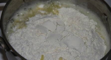 - Voeg, nadat de boter is gesmolten, de gezeefde bloem toe. Kneed het mengsel enkele minuten krachtig en haal het van het vuur.