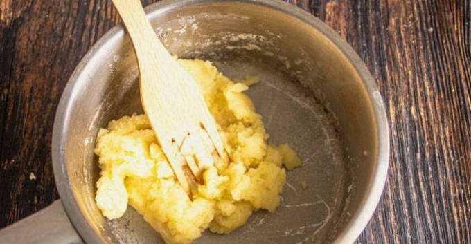Breng een glas water aan de kook in een pan, voeg zout, stukjes boter en bloem toe.
