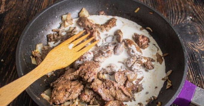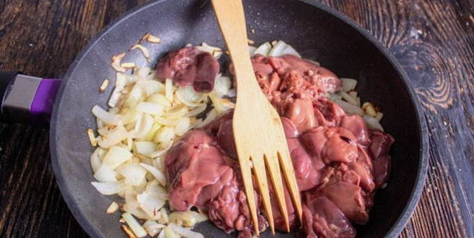 - Bak voor zelfgemaakte paté de uien in plantaardige olie. Ook sturen we hier stukjes kippenlever naartoe.