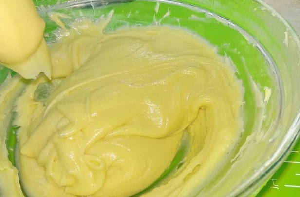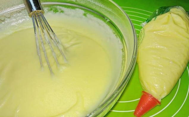 Klop eieren met suiker en vanille, voeg bloem en melk toe. We koken de massa gedurende 2 minuten, onder regelmatig roeren.