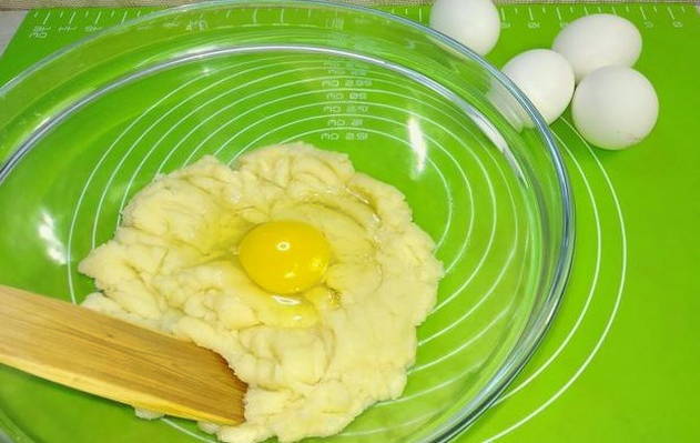 - Breek kippeneieren in het afgekoelde product. Kneed opnieuw tot een gladde massa.