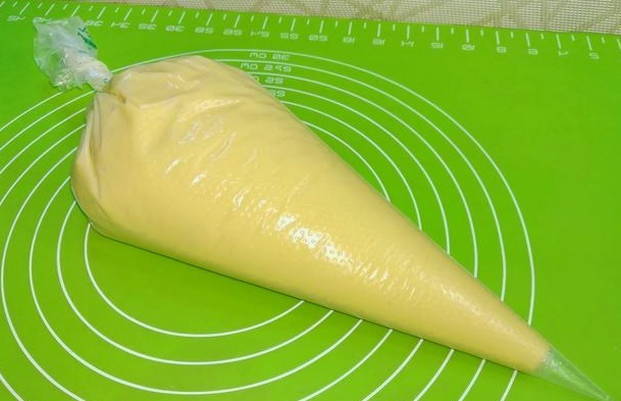 - We plaatsen het deeg in een spuitzak. Gebruik het om de soesjes op een bakplaat met bakpapier te persen.