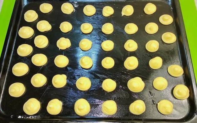 - Knijp met een spuitzak het custarddeeg uit op een bakplaat met bakpapier.