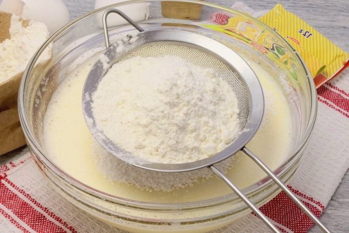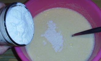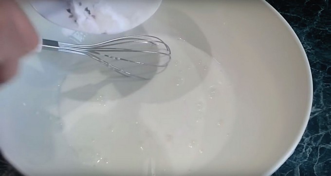 Giet kefir, geblust met soda, in een bak met een eiermengsel. Roer goed om het mengsel volledig homogeen te maken.
