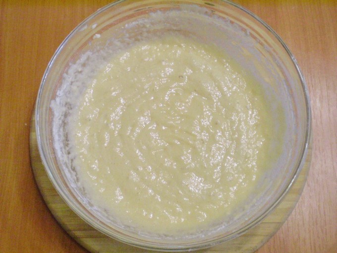 - Eieren, geklopt met suiker, giet voorzichtig in een kom met griesmeel en kefir en meng de ingrediënten goed. Het deeg moet volledig homogeen en matig dik zijn.