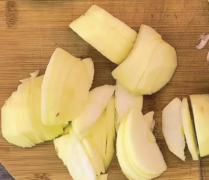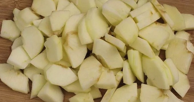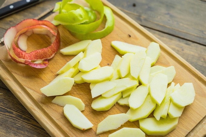 - Was de appels grondig onder stromend water, schil ze indien gewenst. Snijd het fruit vervolgens in dunne plakjes, plakjes of gewoon blokjes. Begin met het bereiden van de eieren.