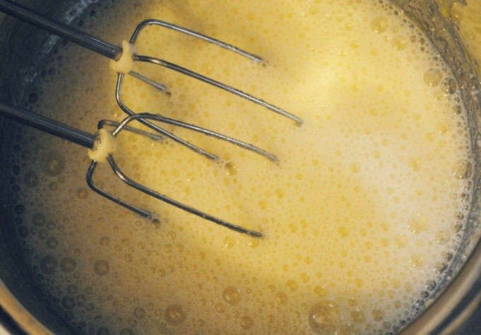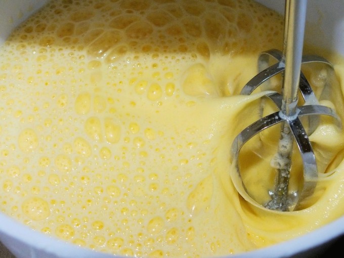 - Klop de eieren met de kristalsuiker luchtig. Het duurt ongeveer 7-10 minuten als je een goede mixer hebt.