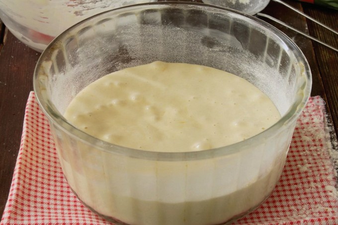 - Meng bloem met bakpoeder en zeef in porties tot een wrongel-eierbasis, terwijl je een zacht deeg kneedt.