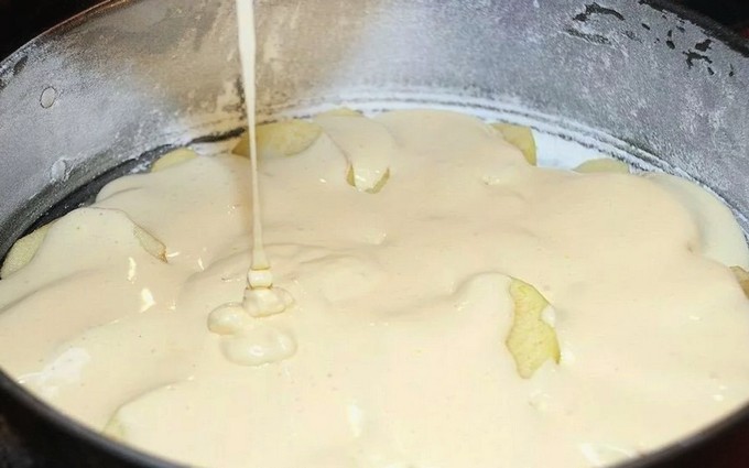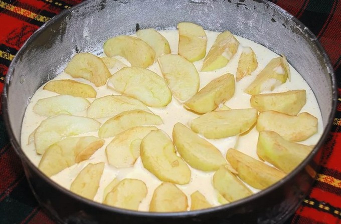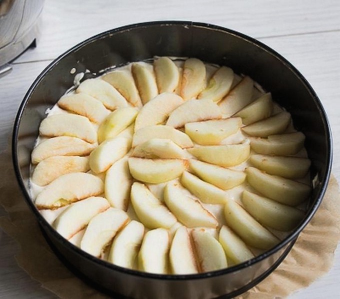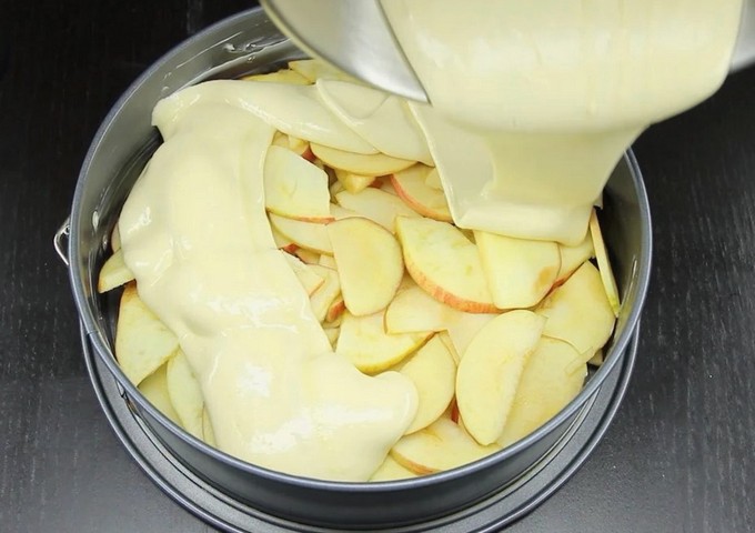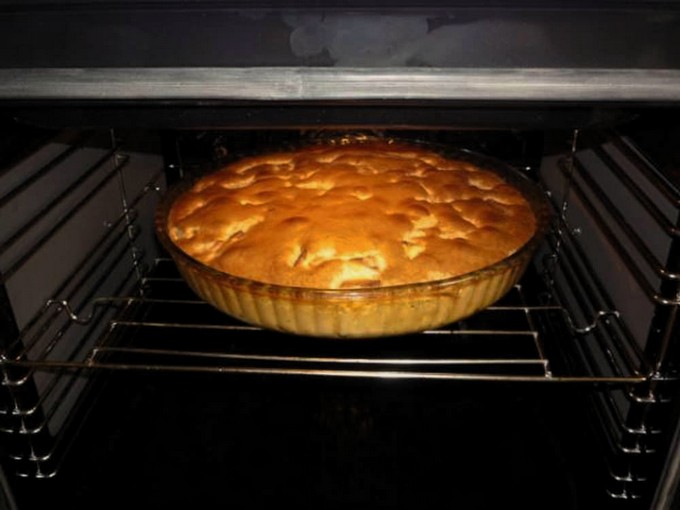 - Giet het resterende deeg in de appelvorm en plaats de cakevorm in de voorverwarmde oven op 180 graden.