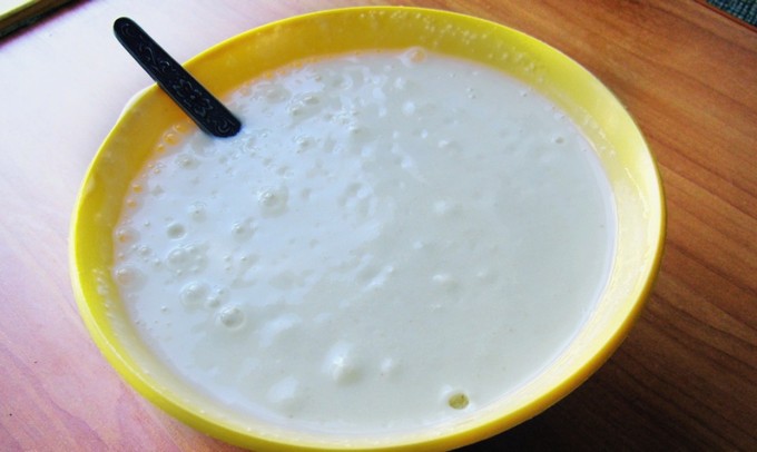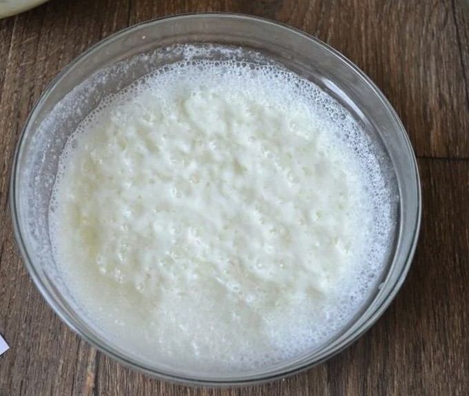 - Haal eerst de kefir uit de koelkast en warm deze een beetje op tot kamertemperatuur. Voeg vervolgens zuiveringszout toe aan de kefir en meng goed. Het is noodzakelijk dat er bellen op het oppervlak van kefir verschijnen.