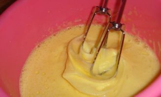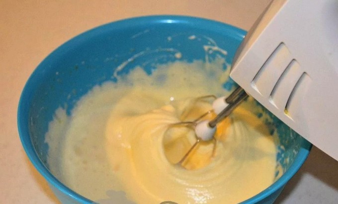 - Terwijl de kefir wordt toegediend, combineer je de eieren met suiker en klop je goed met een mixer. Het is niet nodig om een dicht schuim te krijgen, maar alle suiker moet zijn opgelost.