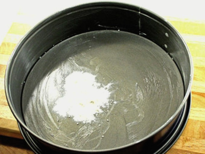- Giet het deeg direct op de appellaag in een taartvorm en druk plat. Plaats vervolgens de halffabrikaat gelei charlotte in de oven, die moet worden voorverwarmd tot 180 graden.
