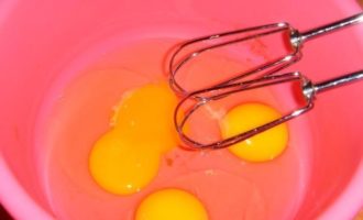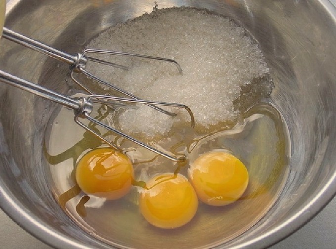- Breek de kippeneieren in een mengkom of gewoon in een gewone kom. Klop ze tot zich een luchtig schuim vormt en giet langzaam kristalsuiker bij het eimengsel. Als alle suiker is opgelost en er schuim uit de eieren komt, kun je verder met deeg.