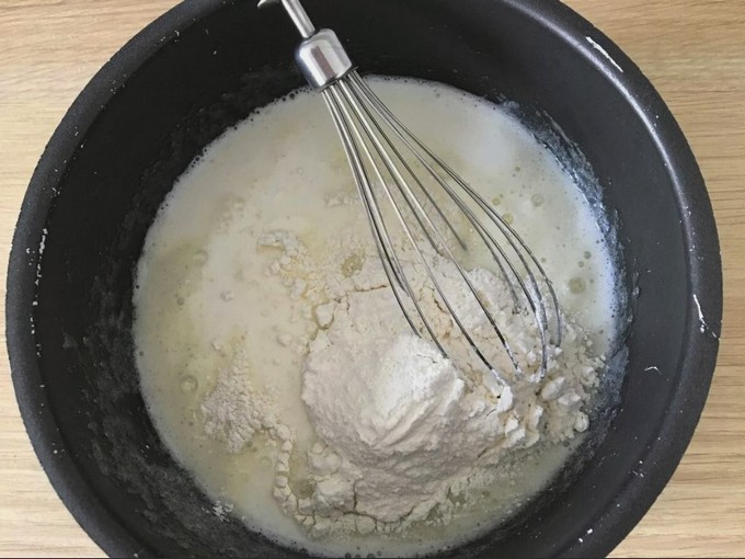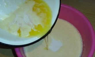 Giet daarna de boter in de kom met het toekomstige deeg en meng alles voorzichtig tot de vloeistof volledig homogeen is.