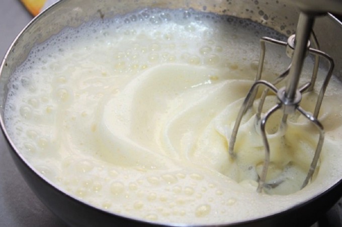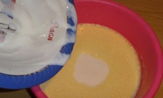 - Eieren, geklopt met suiker, mengen met zure room en kwarkroom, de eieren voorzichtig verdelen en roeren in de wrongel.