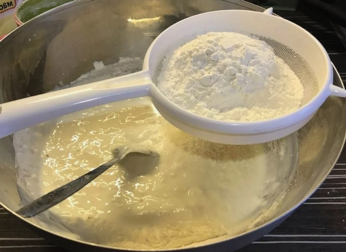 - Giet het ei-suikerschuim bij de kefir en meng voorzichtig. Begin vervolgens de bloem portiegewijs in de vloeistof te zeven terwijl u het gladde deeg kneedt. Het deeg moet eruit zien als goede zure room, niet vloeibaar en niet dik.