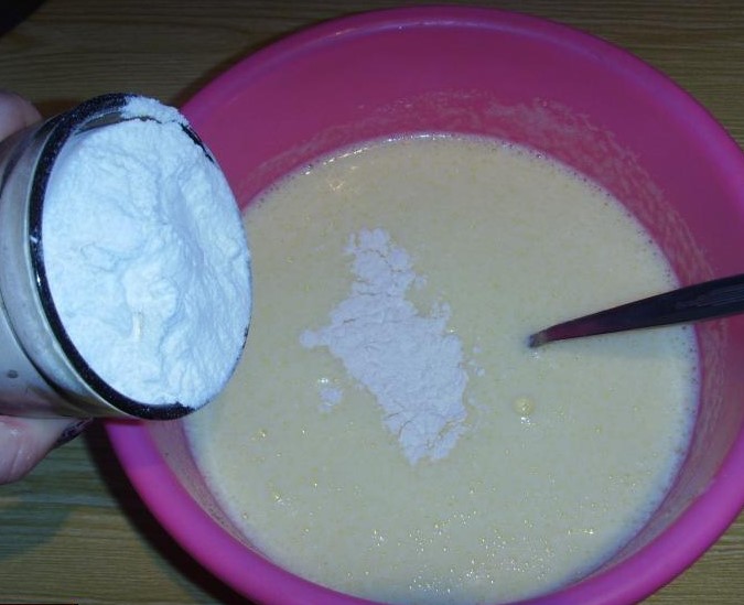 Giet kefir, geblust met soda, in een bak met een eiermengsel. Roer goed om het mengsel volledig homogeen te maken.