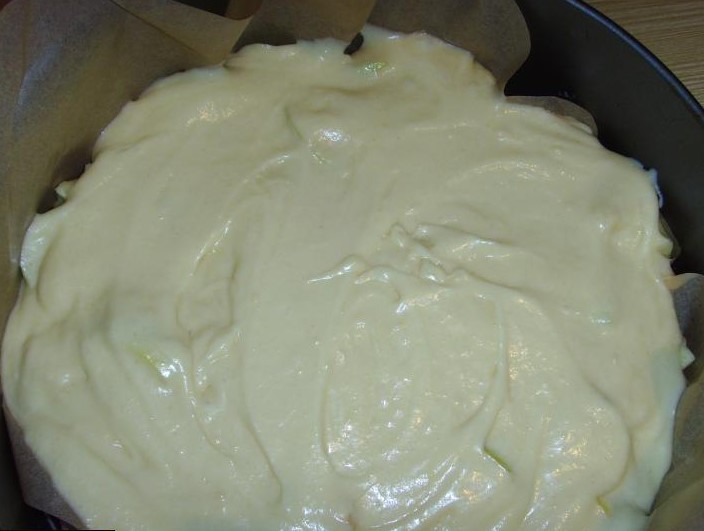- Giet het resterende deeg in de appelvorm en plaats de cakevorm in de voorverwarmde oven op 180 graden.