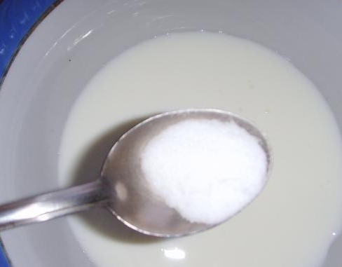 - Haal eerst de kefir uit de koelkast en warm deze een beetje op tot kamertemperatuur. Voeg vervolgens zuiveringszout toe aan de kefir en meng goed. Het is noodzakelijk dat er bellen op het oppervlak van kefir verschijnen.