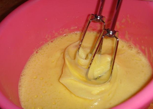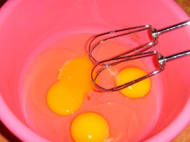 - Breek de kippeneieren in een mengkom of gewoon in een gewone kom. Klop ze tot zich een luchtig schuim vormt en giet langzaam kristalsuiker bij het eimengsel. Als alle suiker is opgelost en er schuim uit de eieren komt, kun je verder met deeg.